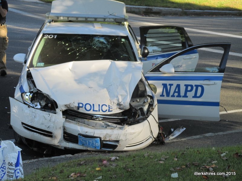 The front of the North Adams cruiser was heavily damaged, and the impact appeared to be on the front driver's side. The second car, a Mercury sport-utility vehicle, also sustained heavy front-end driver's side damage, with the front panel torn from the car. The windshield was fractured on the driver's side.