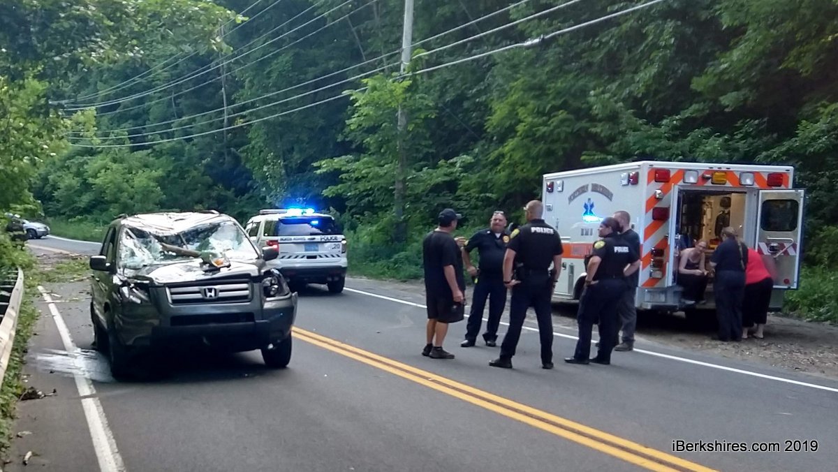 The driver was heading east when a tree fell on the south side of the road at about 5:20 p.m. Police, fire and Northern Berkshire EMS responded. The driver was uninjured but Honda incurred significant damage to the roof, windshield and hood. A piece of wood also pierced the back passenger tire.