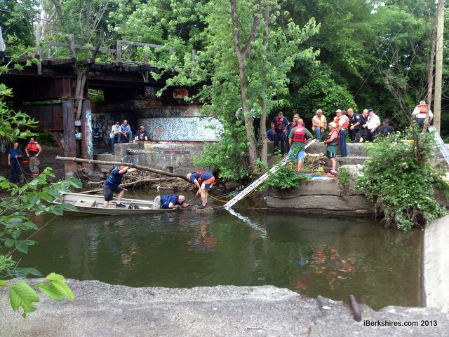 Update, Wednesday, June 26, 2013 at 4:00 p.m. : The body of a drowning victim in the Housatonic River near the Mill Street dam was recovered after responders sandbagged the pipe's intake, alleviating the water flow that was pinning the body to grating inside the pipe.