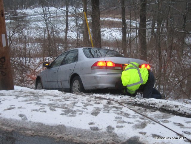 Officers at the scene said no one was injured in the incident, in which the car with New York license plates apparently slid off the storm-slickened road and downhill toward the Hoosic River.
