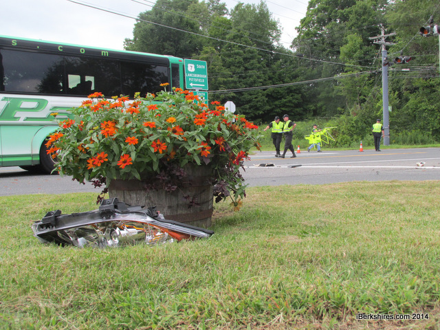 The state police reconstruction team is investigating a fatal accident that occurred Wednesday afternoon at the Five Corners. Above, the headlight of a bus involved in the crash lies next to a barrel of flowers.