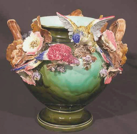 The French barbotine majolica bowl is about 14 inches tall with a diameter of about 20 inches and features ornament birds and flowers, according to reports on multiple websites dedicated to antiques.