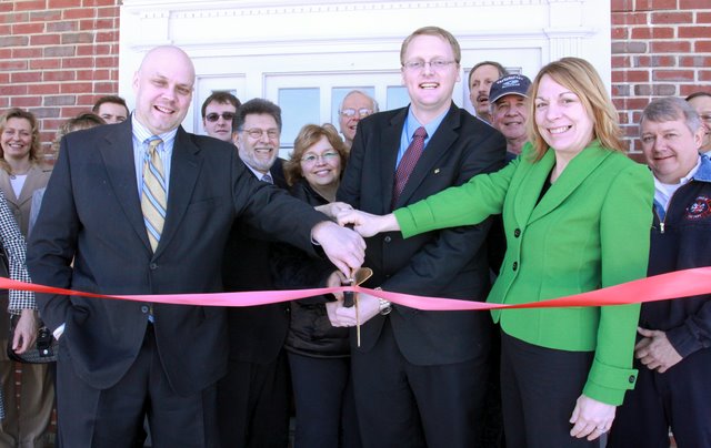 Cutting the ribbon at the March 7 grand opening celebration NBT Bank Area Manager Daniel Kinney, left, Lenox Chamber of Commerce Director Ralph Petillo, Lenox Selectwoman Linda Procopio Messana, Lenox Branch Manager John Bortolotto and Miss Hall's School Chief Financial Office Susan Baumgarten.