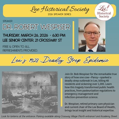 Dr. Bob Wespiser will give an illustrated talk, Lee’s 1928 Deadly Strep Epidemic at the Lee Senior Center, 21 Crossway Street, Lee. This presentation is free and open to the public and is part of the Lee Historical Society Speaker Series. Look for the lanterns near the Senior Center entrance. Parking is available along the North entrance to Crossway Village as well as on Academy Street. Refreshments will be served.