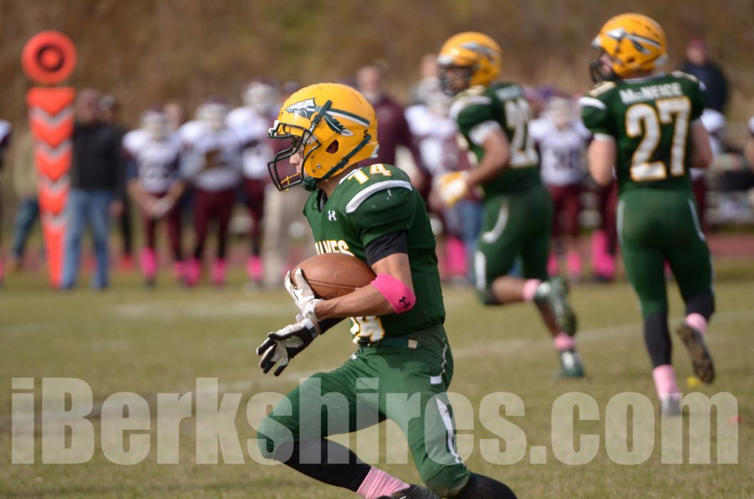 Easthampton got the ball back on its 39 with 48 seconds left after Whiteley's TD. Max Weir completed four passes to get his team as far as the 24. But two big tackles by Taconic preserved the lead: First Gage dragged a receiver down in bounds to keep the clock running. Then Devon Walker made a stop at the 11 on the game's final play.