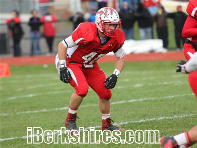 Down by one point with just under five minutes to go, the Mounties took over on their own 23-yard line and marched 53 yards down to the Hoosac Valley 26-yard line. Quarterback Brodie Altiere dropped back with a minute and 30 seconds to play and found tight end Robbie Buffis open on the right side of the field. Buffis hauled in the pass and scrambled up the sideline towards the end zone.