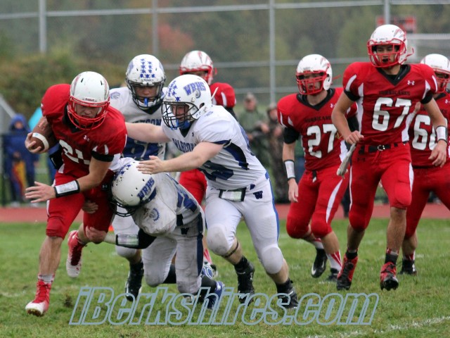 After three quarters of football that saw both teams trade possessions all day without a single score, Hoosac Valley was given a gift deep in Wahconah territory. Facing third down and three on his own 23-yard line, Warrior quarterback Nick Clayton was just able to handle a high snap from his center, but as he ran forward the wet conditions caused the ball to slip out of his grip. After it bounced around beneath the lineman, Hoosac's Tyler Mach pounced on it giving his team great field position on the 19-yard line with just less than seven minutes left in regulation.