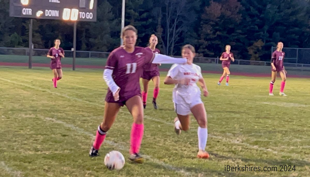 In the 28th minute, Mounties back Rowan Apotsos made a strong play to deny Raifstanger on a through ball up the left wing into the final third. A minute later, Monument Mountain’s Annette Boyko fired a shot on goal that O’Connor deflected over the end line for a corner kick, and then O’Connor made another save on the ensuing set piece.