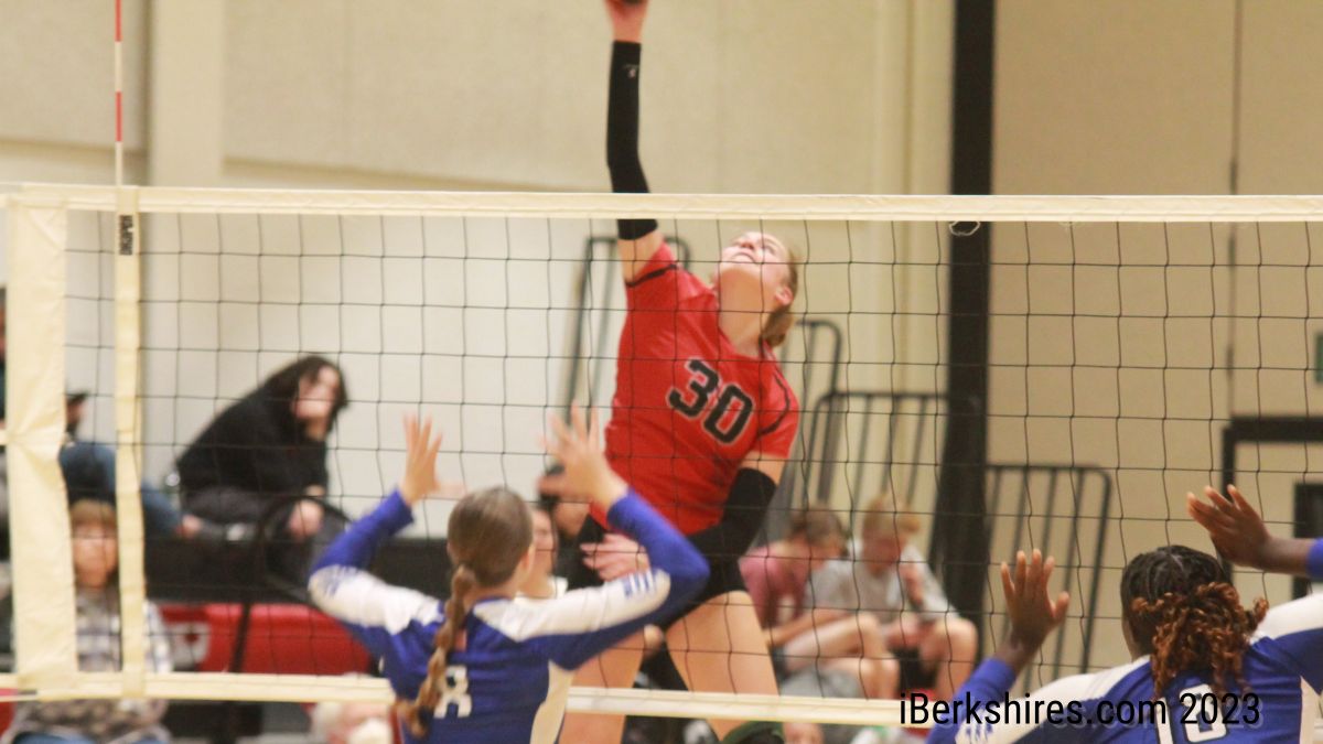 Julia DeChaine (five kills, three aces) started the third set with a five-point run, and Mount Greylock never looked back. Jacqueline Brannan (four kills, two aces) erased all doubt when she took the ball with her team ahead, 19-8, and served five straight points – the last two on aces – to set up match point.