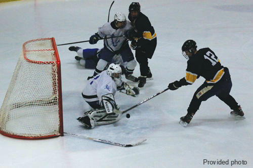 After regulation time, the score was tied, 4-4. After the Eagles killed an early power play, Mount Everett forward Jake Corcoran took the puck end to end on a breakaway and finished the game with a shot on the goalie, glove side.