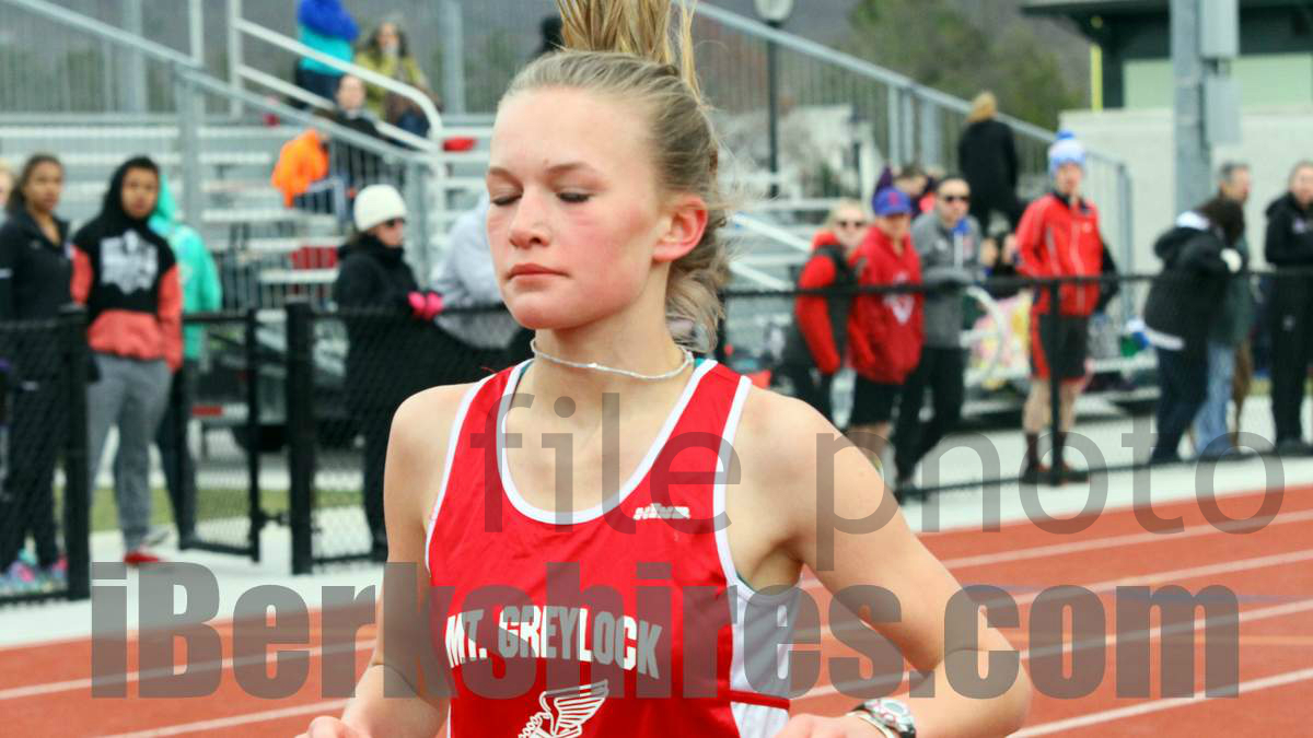 800 METER RUN -- 1. Maddie Albert, Mt. Greylock, 2:38.01; 2. Margo Smith, Mt. Greylock, 2:46.97; 3. Bella Bote, Mt. Greylock, 2:52.19; 4. Shayla Fitzgerals, Taconic, 2:54.00; 5. Hannah Locklear, Mt. Greylock, 2:56.87; 6. Mary Decelles, Taconic, 3:00.91.