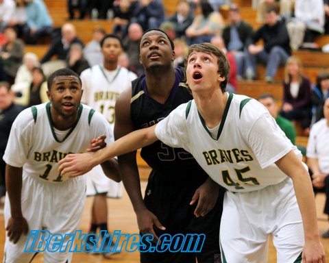 The Crusaders' Lavante Wiggins (33) and Jon Bianchi (15) cover the Braves' Trayvon Sims, who beat the buzzer to give Taconic the win, 63-61. See more photos here. |