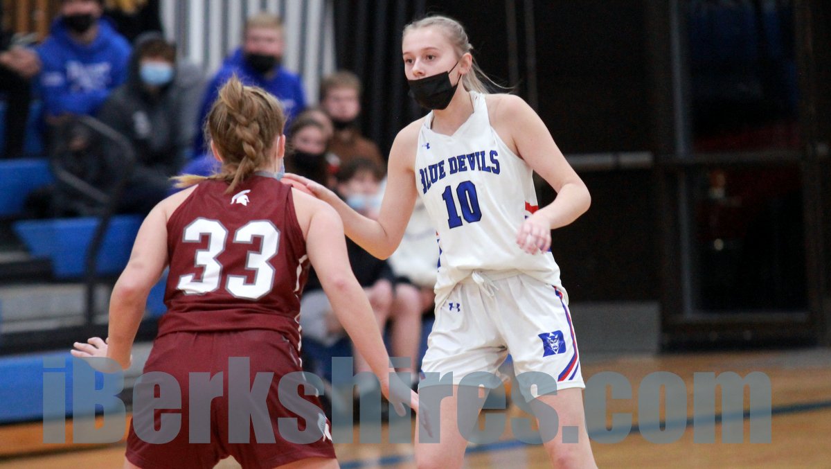 Maddison Houghtaling, Hannah LaCasse and Danielle Harnick each scored six points for the Blue Devils, who won despite missing two key regulars, Kayla McGrath and Lauren Davis.