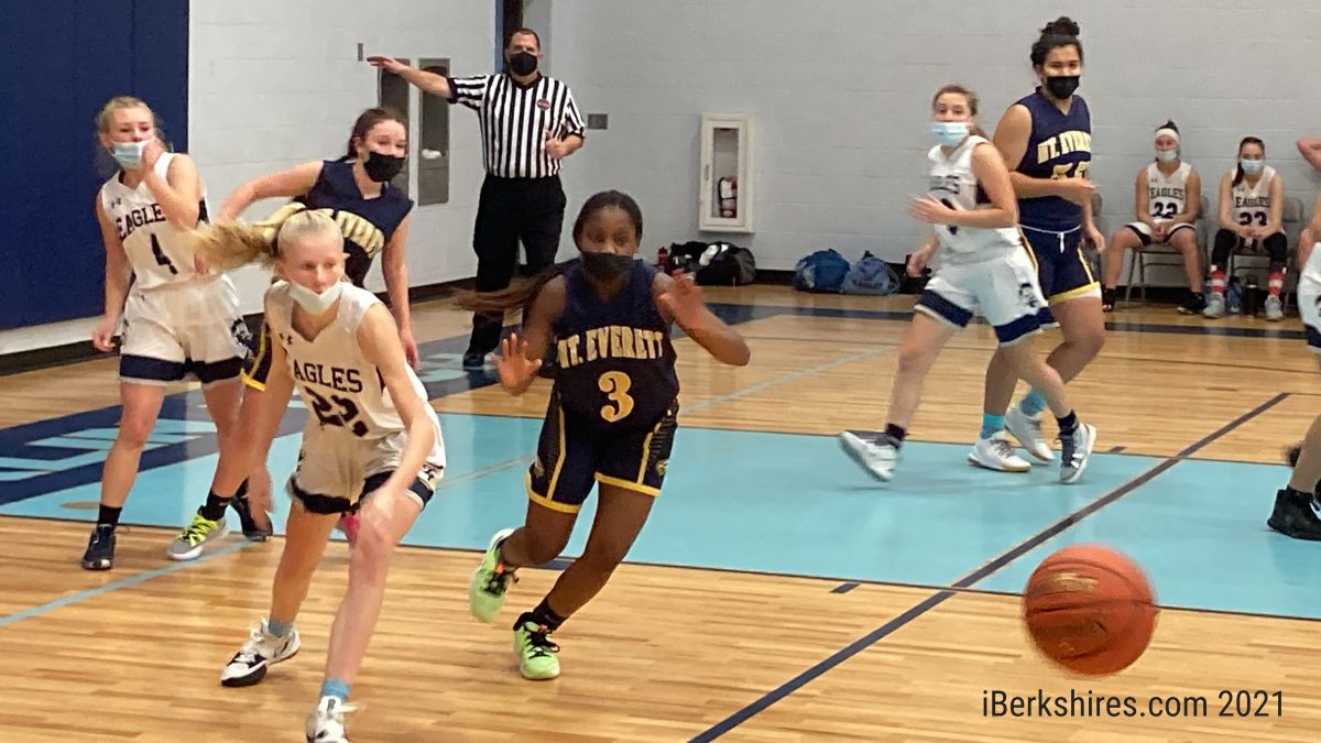 Mount Everett’s defense produced some of the only scoring opportunities in that frame as Hudah Nguy Nkulu scored in transition off a defensive rebound, Emma Goewey scored in transition off another rebound and Julia Devoti (team-high seven points) got to the line in transition after a Nguy Nkulo steal and made it 7-0 to end the quarter.