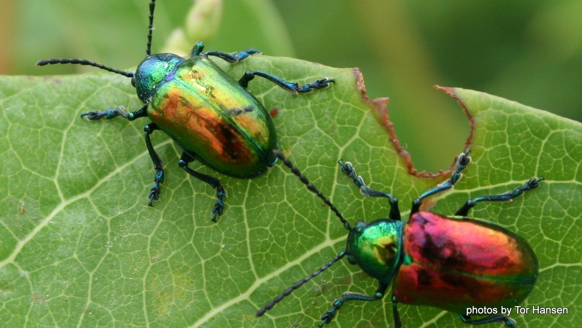 Speaking of opulent beetles, the fiery colors inherent in the surface cuticles, the stout chitinous exoskeletons of dogbane beetles (Chrysochus auratus) amaze our senses with a quintessential aura like some artist's dream creature with metallic hues lacquered in high gloss. They appear to have evolved to feed only on dogbane, a hearty weed similar to milkweed, but with slender green leaves and sporting tiny white flowers. Their abundance suggests these sparkling beetles have no known predators, and such opulence may indicate a distasteful interior (?) When seen in small groups see if a little pride arises that such beauty exists for our admiration. Apparently, they are not a serious pest on any cash crops or garden horticulture favorites.