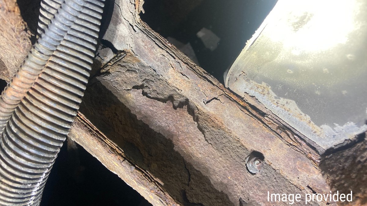 Assistant Chief Michael Noyes told the committee that more than half the thickness of the engine's original frame is gone in some places and showed the panel photos he took of the apparatus' underbody.