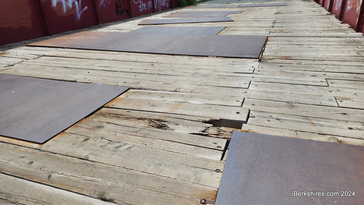 The heavy lumber decking on the bridge has been failing and has been covered with a hodgepodge of metal plates over the years. In March, the mayor reported that the bridge and the vacant Sons of Italy were being evaluated.