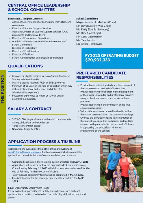 Applications are due by Feb. 7 with the anticipation intial interviews will be scheduled by the end February. The School Committee hopes to have finalist interviews by April 1.