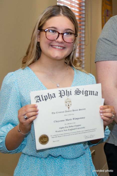 Alpha Phi Sigma is the national criminal justice honor society with a mission to promote critical thinking, rigorous scholarship, and ethical standards of the criminal justice profession. Wimpenney is working toward a degree in criminal justice at the Springfield college.