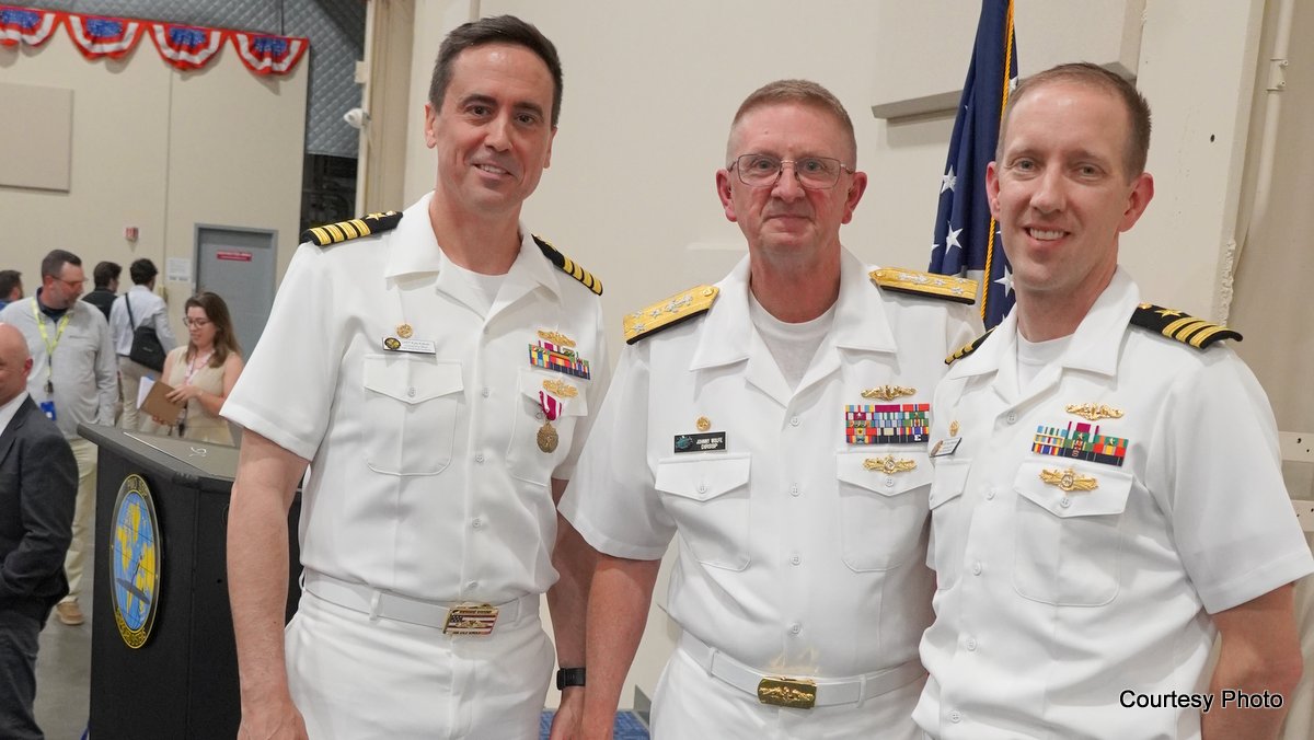 Cmdr. Todd Williamson, right, is the new commanding officer at SPS. With him are former commander Capt. Kyle Kebold, left, and SPS Director Vice Adm. Johnny Wolfe Jr.
