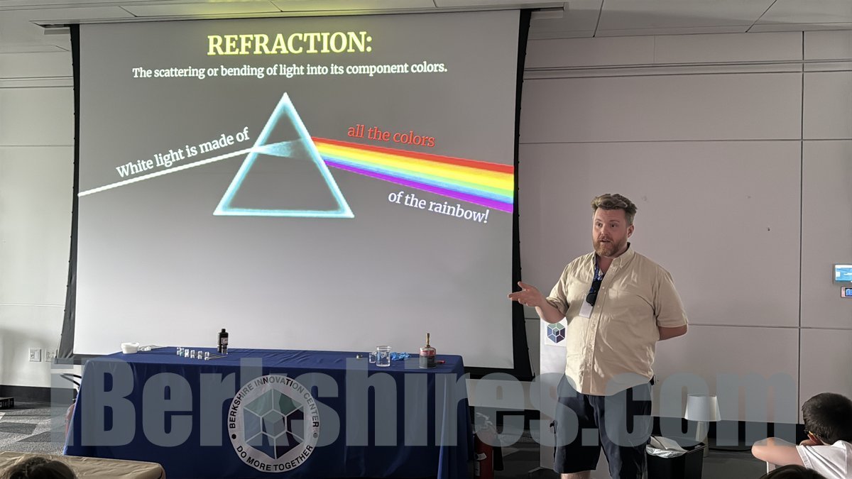 Flying Cloud education coordinator Christian Drake leads the camp through some engineering and scientific principles on Wednesday at the Berkshire Innovation Center. More photos here.