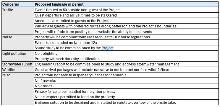 Among the conditions were: appropriate city signoffs, including the fire chief and Con Comm; guest count lower than 50; limited events ending at 10 outside and 11 inside; a study on the lot lines prior to construction; no audible music at the lot lines; and limiting the number of events.